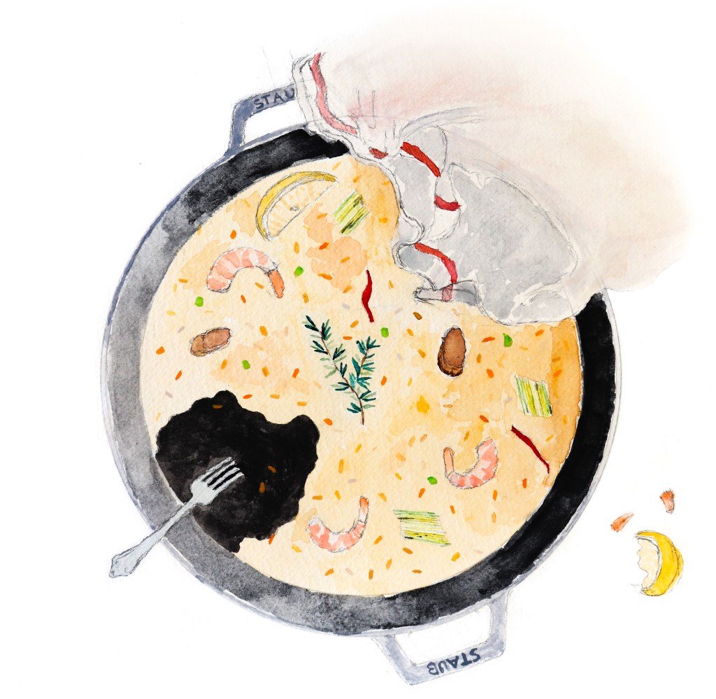 I set the finished paella on the table, shrouded in a kitchen towel, and pulled up my chair, watching steam rise through the white cotton and fill the late morning air with the smell of saffron. I folded back the towel, raised my fork, and dug in. The rice was firm and fragrant, with a toasted crust at the bottom. The shrimp were just cooked, and bright with lemon and parsley. I ate the whole thing. Then, I cleaned the dishes, made the bed, and got started with dinner.